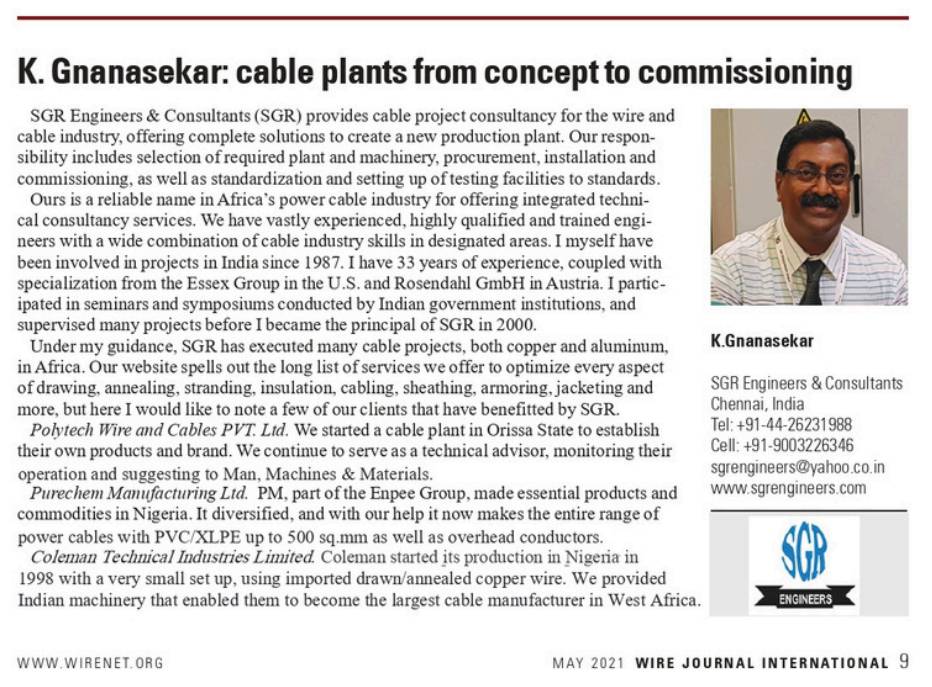 We were honored to have been featured in Wire Journal International as one of the top 25 consultants in the industry. This recognition reflects our unwavering commitment to excellence, innovation and delivering exceptional value to our clients worldwide. At SGR Engineers & Consultants, we take pride in driving success and setting benchmarks in the industry through our expertise and dedication.