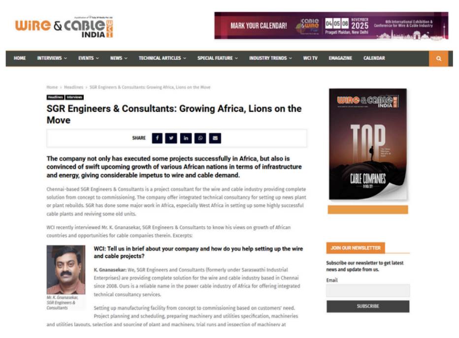 We had the privilege of being interviewed by Wire & Cable India, a leading platform for the wire and cable industry, to share insights about our impactful projects in Africa. The feature titled "Growing Africa: Lions on the Move" highlights our contributions to the growth of the wire & cable sector in emerging markets like Africa. We discussed our expertise in delivering end-to-end project consultancy in Africa, the challenges and opportunities in the African market & how SGR Engineers & Consultants is enabling sustainable growth and innovation. The article reflects our commitment to excellence and showcases our dedication to advancing the wire and cable industry on a global scale. The interview can be accessed via this link : Growing Africa: Lions on the Move.